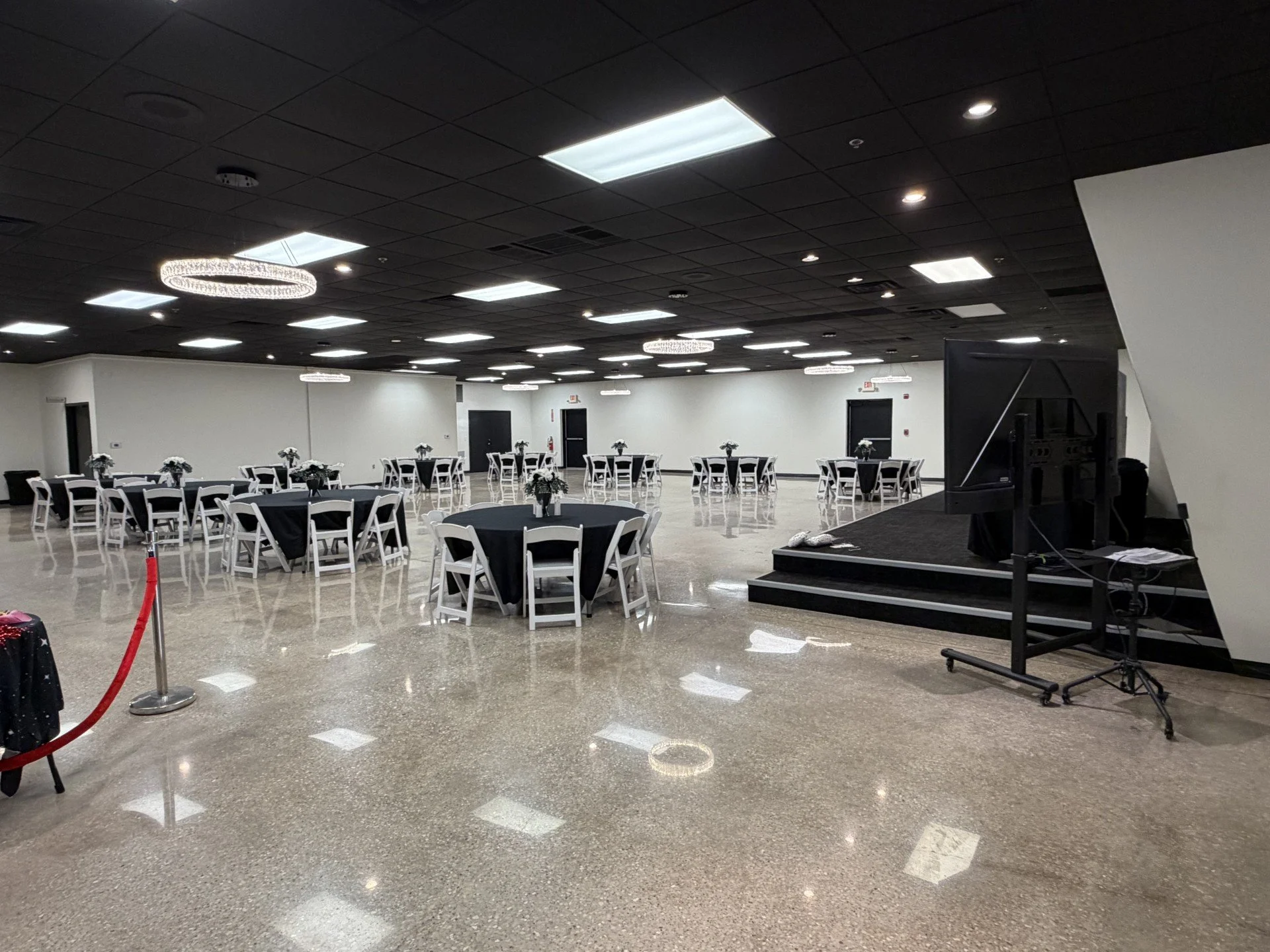 Recently enhanced with newly painted black ceilings and a fully renovated stage, the room now offers a bold, modern aesthetic. The stage is complemented by elegant chandeliers, creating a striking focal point perfect for head tables, presentations, DJs, and live performances.
